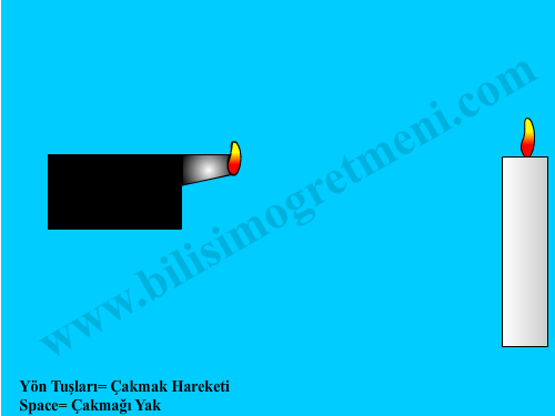 Actionscript Klavye Olayları (Tuş Kontrolü) dersimizde tuş kontrolünün nasıl yapılacağından ve kontrol edilen tuşların animasyon içerisinde nasıl kullanılacağından bahsetmiştik. Şimdi aşağıdaki uygulamayı yapacağız çalışma alanına tıkladıktan sonra yön tuşları ve space tuşu yardımı ile mumu yakmaya çalışın Sahneye Çakmak, mum , fitil çizip film klibi haline getiriyoruz. çakmak ve fitilin ikinci karelerinden itibaren elips çizip alev şekli ile şekil arası oluşturuyoruz ve birinci karelerinde stop(); kodunu ekliyoruz,