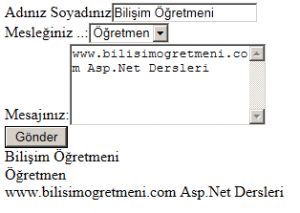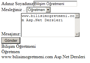 Web formları sunucuya iki şekilde verileri gönderir; formdaki tüm elemanlar doldurulup kullanıcının bir butona basması ile , diğer bir yöntemde form üzerindeki herhangi bir elemanla kullanıcın işi biter bitmez yani bir textbox’a yazı yazdıktan sonra listeden bir eleman seçtikten sonra gibi . Hemen örnekle açıklayalım Aşağıdaki sayfamızda bilgiler forma giriliyor daha sonra gönder butonuna basılınca bilgiler ekranda yazılıyor.