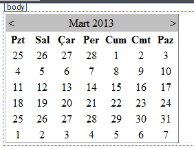 Asp.Net ile kullanabileceğimiz kontrollerden biride Calendar (Takvim) Kontrolüdür. Kullanıcının ay, gün hafta seçme işlemlerini yapabileceği birçok özelliği bulunan bir kontroldür tasarım alanına eklendiği zaman aşağıdaki görüntü ve kodlarla oluşturulur. Tasarımı ve takvimin görünümünü veya kullanışını özelleştirebilirsiniz bunun için calendar kontrolünün bazı özelliklerini değiştirmeniz gerekiyor bu özelliklerden bazıları