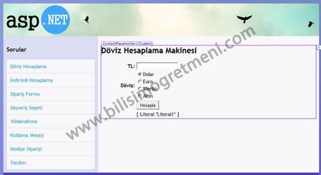 Şimdiki uygulamamızda masterpage içinde Döviz Hesaplama, İndirim Hesaplama, Sipariş Formu, Alışveriş Sepeti, Yönlendirme, Kutlama Mesajı, Hediye Siparişi ve Yardım sayfalarını asp.net form elamanları kullanarak ayrı ayrı sayfalarda yapacaksınız uygulama dosyaları konu sonundadır.