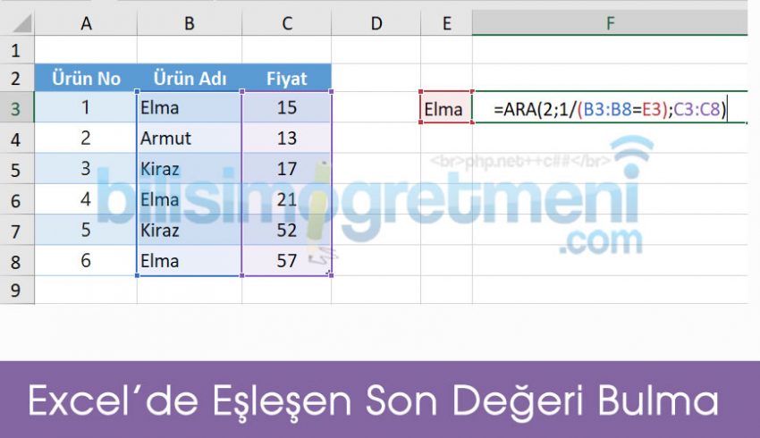 Burada tabloda yer alan aynı ürünlerin farklı fiyatları eklenmiş durumda, burada bizden istenen Örnek olarak “Elma” değeri ile eşleşen “15-21-57” değerlerinden en son eklenen 57 değerini arayıp bulma. Bunun için kullacağımız excel formülü Ara, Formülün tam yazılmış şekli