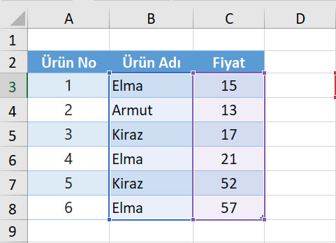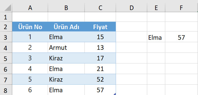 Yazmış olduğumuz arama formülü ile verilen tablodan Elma değeri aranıyor ve c3:c8 sütununda eşleşen değer sonuç olarak geliyor