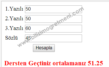 Javascript örneklerimize öğrenci ders ortalamasını hesaplayan uygulama ile devam ediyoruz, bu uygulamamızda öğrencinin girmiş olduğu yazılı ve sözlü notlarına göre ortalama hesaplanarak 50’den büyük olanlar için dersten geçtiniz, diğerleri için dersten kaldınız mesajını veriyoruz, mesaj ekranda görüntülenirken geçenler kırmızı, kalanlar mavi renkte gösteriliyor bunun için küçük bir css kodu ile id’ye göre renklendirme işlemi yaptık. Uygulamayı aşağıdan test edebilirsiniz..