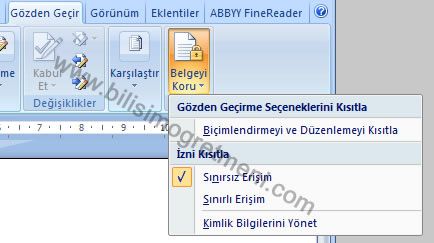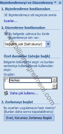 Word 2007’de hazırlamış olduğunuz bir belgenin, sunumun veya ödevin başkaları tarafından değiştirilmeden sadece okunabilmesi ve bu sayede yorum ve önerilerini belirtmesini isteyebilirsiniz. Bu işlemi yapabilmek için menüde yer alan “Gözden Geçir” kısmından “Belgeyi koru” seçeneğini seçiyoruz bu menüden yapacağımız ayarlamalar ile başka kullanıcıların orjinal belde üzerinde sadece okuma işlemi yapmasını değişiklik yapmalarını da engellemiş oluyoruz.