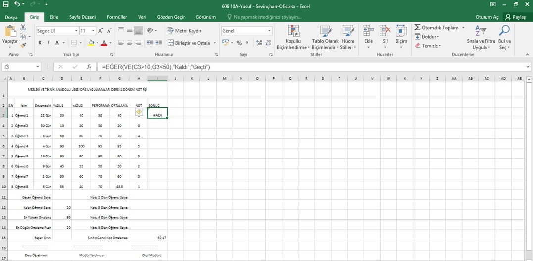 Not ortalamasının 50 den büyük olduğu zaman geçti ,50 den küçük olduğu zaman kaldı yazan formül (A10 hücresinde) nedir acaba acil Yardımcısı olabilir misiniz ?