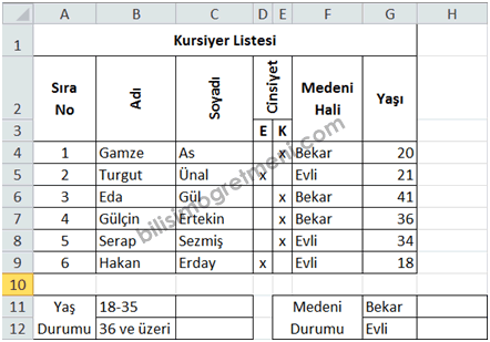 Bu tabloya göre 18-35 yaş ile 36 ve üzeri yaşları olan kursiyerlerin sayılarını otomatik olarak veren aşağıdaki birinci tabloyu hazırlayınız.