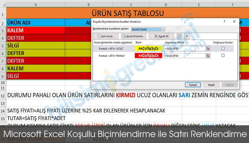 Koşullu Biçimlendirme ile Satırı Renklendirme