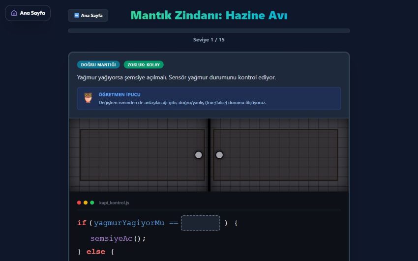 Zindandan Ancak Doğru Kodlarla Çıkabilirsin! Algoritma Zindanı oyununda karakterimiz karanlık bir labirentin içine düşüyor. Öğrencilerin görevi, “İleri Git”, “Sağa Dön”, “Eğer Engel Varsa Karar Ver” gibi temel programlama bloklarını mantıklı bir sırayla dizerek karakteri çıkışa yönlendirmektir.