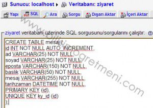 ve bu veri tabanı içerisinde mesajları tutmak için mesaj isimli aşağıdaki özelliklerde bir tablo oluşturuyoruz..