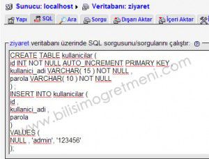 CREATE TABLE kullanicilar ( id INT NOT NULL AUTO_INCREMENT PRIMARY KEY , kullanici_adi VARCHAR( 15 ) NOT NULL , parola VARCHAR( 10 ) NOT NULL ) ; INSERT INTO kullanicilar ( id , kullanici_adi , parola ) VALUES ( NULL , 'admin', '123456' );