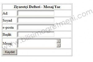 <html xmlns="http://www.w3.org/1999/xhtml"> <head> <meta http-equiv="Content-Type" content="text/html; charset=utf-8" /> <title>Ziyaretçi Defteri - Mesaj Yaz </title> </head> <body> <form name="frm_msj_kaydet" method="post" action="mesaj_kaydet.php"> <table width="298" height="193" border="1"> <tr> <td colspan="2" align="center"> <b>Ziyaretçi Defteri - Mesaj Yaz </b> </td> </tr> <tr> <td> Ad: </td> <td> <input type="text" name="f_ad" /> </td> </tr> <tr> <td>Soyad </td> <td> <input type="text" name="f_soyad" /> </td> </tr> <tr> <td>e-posta </td> <td> <input type="text" name="f_eposta" /> </td> </tr> <tr> <td>Başlık </td> <td> <input type="text" name="f_baslik" /> </td> </tr> <tr> <td>Mesaj </td> <td> <textarea name="f_mesaj"> </textarea> </td> </tr> <tr> <td colspan="2"> <input type="submit" name="button" value="Kaydet" /> </td> </tr> </table> </form> </body> </html>