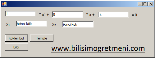 Formunuza 5 adet TextBox ve 2 adet Button ekleyiniz. Button1’in Text özelliğini Kökleri bul ve Button2’nin Text özelliğini Temizle olarak değiştiriniz. Button1_Click olayına aşağıdaki kodu yazınız. Button1_Click olayına Button’a çift tıklayarak ulaşabilirsiniz.