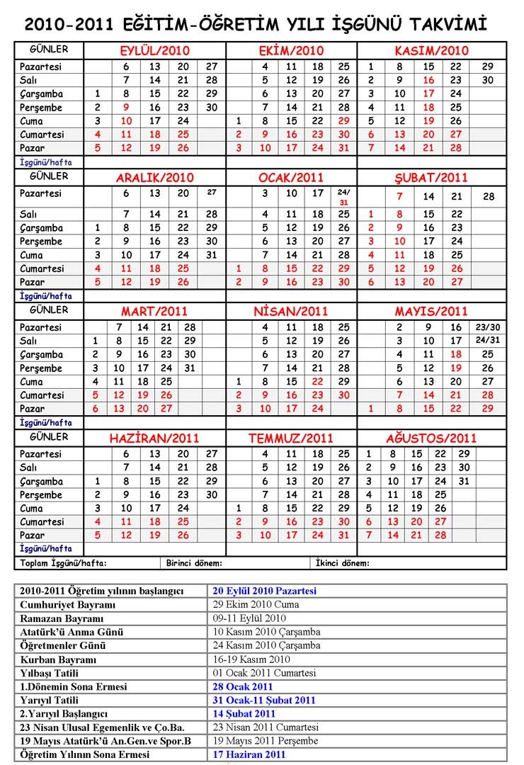 2010-2011 Öğretim Yılı Meb Çalışma Takvimi