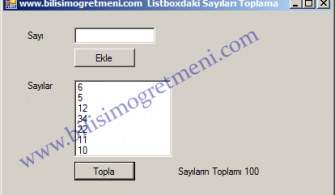 Bu örneğimizde listbox'a eklenen sayılarının toplamını bulacağız. Bunun için ilk olarak listbox'daki eleman sayısını öğrenmemiz…