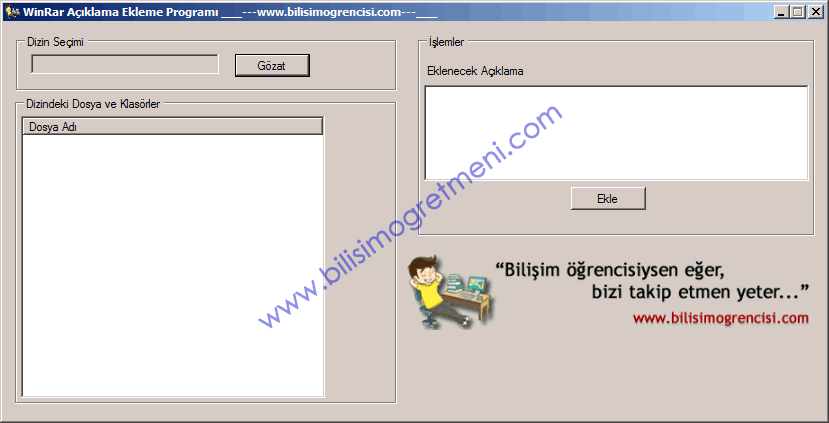 Birden fazla sıkıştırılmış dosyaya açıklama eklemek için kullanabileceğiniz bir program, kullanışı gayet basit. Dizin Seçin bölümünden eklenecek dosyaların yer aldığı klasörü seçin, daha sonra sağ tarafta yer alan açıklama bölümüne bilgileri girip Ekle butonuna basarsanız klasörde yer alan tüm sıkıştırılmış dosyalar yazdığınız açıklama eklenecektir…