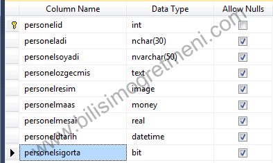 Örnek: ‘personel’ tablosunda, «personeladi» alanı aşağıdaki şekilde tanımlanabilir