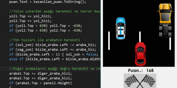 Form üzerine 6 adet pictureBox ekliyoruz bunlardan iki tanesi yol üzerindeki arabalar için, biri bizim kontrol edeceğimiz araba, iki tanesi yol için ve sonuncuda çarpışma efekti için daha sonra birtanede Timer ekliyoruz ve kodlarımız aşağıda
