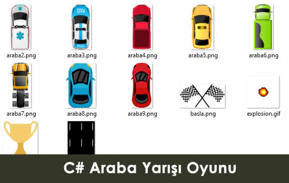 Şimdiki C# örneğimizde araba yarışı oyunu yapacağız, amacımız diğer arabalara çarpmadan en yüksek puanı toplamak kodların arasında açıklama satılarını ekledim ama kısaca oyunu ve form tasarımını anlatayım öncelikle oyun için kullanacağımız arabaları, yolu resim olarak ayarlıyoruz bizim kullanacaklarımız ..:
