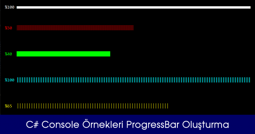 Şimdi ise ProgressBar örneğini Console uygulamasında nasıl yapıldığına bakalım. ProgressBarCiz isimli bir fonksiyon oluşturup fonksiyon parametrelerine göre ekleme işlemi yapılıyor