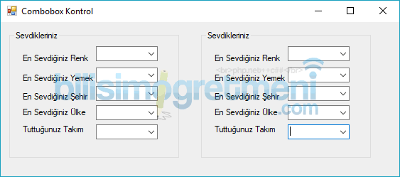 Hazırlamış olduğunuz form içindeki yer alan Comboboxlar farklı groupboxlar içinde ise ve siz sadece belli bir gruptaki nesnelere erişmek istiyorsanız ne yapmamız gerekiyor onu açıklamaya çalışacağım, ilk olarak aşağıdaki form tasarımını hazırlıyoruz aynı özelliklerde ama farklı GroupBox için de olan Comboboxlarımız var