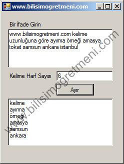 Girilen bir ifadedeki kelimelerden verilen harf sayısına uyan kelimeleri ayıran program, işlemleri yapabilmek için split ile ayırma daha sonra her ayrılan parçanın Length ile harf sayısının kontrolü ile yapılıyor program ve kodlarımız