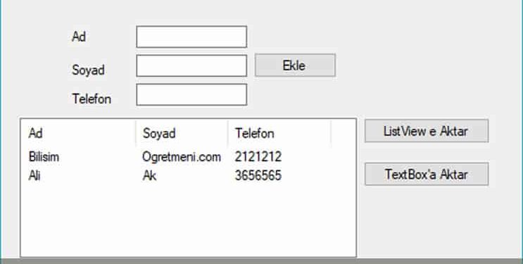 Yaptığınız uygulamada Form’lar arası ListView de yer alan bilgileri başka bir ListView e yada textbox a aktarmak istiyorsanız yapmanız gereken işlem Form2’de yer alan veri aktarılacak ListView veya textboxların Modifiers Özelliğini Public yapmak ve Bilgileri aktar Butonuna ListView için