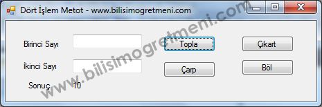 private void button1_Click(object sender, EventArgs e) { int sayi1 = Convert.ToInt32(textBox1.Text); int sayi2 = Convert.ToInt32(textBox2.Text); label4.Text = Convert.ToString(sayi1 + sayi2); temizle(); }//http://www.bilisimogretmeni.com/ private void temizle() { textBox1.Clear(); textBox2.Clear(); } private void button2_Click(object sender, EventArgs e) { int sayi1 = Convert.ToInt32(textBox1.Text); int sayi2 = Convert.ToInt32(textBox2.Text); label4.Text = Convert.ToString(sayi1 - sayi2); temizle(); } //http://www.bilisimogretmeni.com/ private void button3_Click(object sender, EventArgs e) { int sayi1 = Convert.ToInt32(textBox1.Text); int sayi2 = Convert.ToInt32(textBox2.Text); label4.Text = Convert.ToString(sayi1 * sayi2); temizle(); } private void button4_Click(object sender, EventArgs e) { int sayi1 = Convert.ToInt32(textBox1.Text); int sayi2 = Convert.ToInt32(textBox2.Text); label4.Text = Convert.ToString(sayi1 / sayi2); temizle(); }Örnek 2-