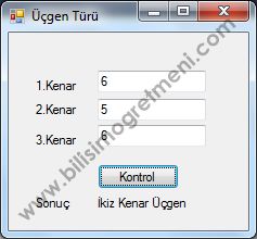 Üç Kenar Bilgisi girilen üçgenin türünü bulan uygulamayı metot kullanarak yapınız.private void button1_Click(object sender, EventArgs e) { int k1 = Convert.ToInt32(textBox1.Text); int k2 = Convert.ToInt32(textBox2.Text); int k3 = Convert.ToInt32(textBox3.Text); ucgenbul(k1, k2, k3); } //http://www.bilisimogretmeni.com/ void ucgenbul(int a,int b,int c) { if (a == b && a == c) { label5.Text="EşKenar Üçgen"; } else if (a != b&& a != c && b!=c) { label5.Text="Çeşit Kenar Üçgen"; } else { label5.Text="İkiz Kenar Üçgen"; } }Örnek 3-