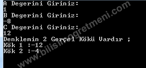 ax2 + bx + c şeklinde verilen bir denklemin köklerini bulan program, program içerisinde kullanıcından a,b ve c değerleri istenecek ve buna göre denklemi sağlayan x için çözüm kümesi elemanları bulunacak.
