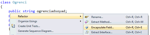 ne yapacağız sonuçlar yanlış çıkıyor hep, işte tam bu anda yardımımıza kapsülleme yetişiyor hatırlayalım ne yapıyordu kapsülleme “Değişkenleri ve verileri hatalı kullanım ve dış etkenlerden koruyor” o zaman hemen sınıfımızı uygun hale getirelim kısa yolumuz vardı hatırlayalım değişkenin üzerinde sağ tıklayıp->Refactor->Encapsulate dememiz yeterli idi
