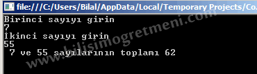 Console.WriteLine(" {0} ve {1} sayılarının toplamı {2}", sayi1, sayi2, sonuç);