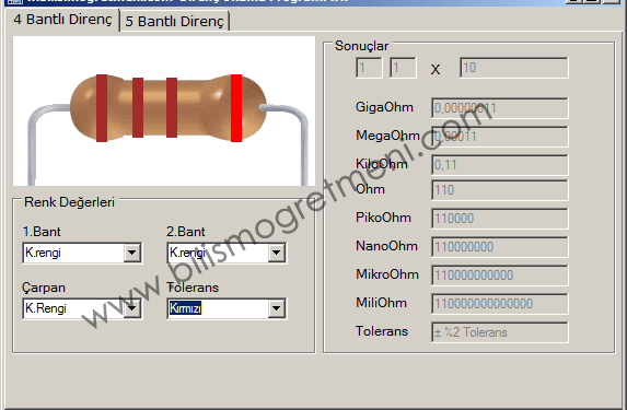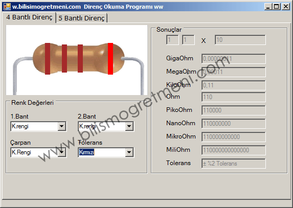 4 veya 5 bantlı dirençlerin renk kodları ile okunmasını kolaylaştırmak için yapılmış bir programdır. Kodlar çok fazla olduğu için sadece direnç renk kodlarını okuma işleminde kullanılacak mantığı yazacağım zaten programı indirip inceleyebilirsiniz anlaşılmayan bir nokta olursa sorularınızı bekliyorum