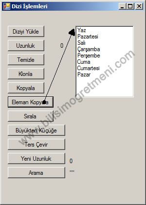 Örneğimizde Array.Copy(gunler, yenigunler, 5); satırı ile gunler dizisinin ilk 5 eleman yenigunler dizisine kopyalanıyor