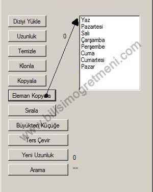 örneğimizde gunler dizisinin elemanları yenigunler dizisine kopyalanıyor, yenigunler dizisinin eleman sayısını kendisine eklenecek dizinin eleman sayısından büyük yada aynı olmalıdır. Örneğimizde yenigunler dizisinin 3 elemanı KIŞ üzerine yeni elemanlar kopyalandığı için silinecektir. yenigunler dizisinin son hali aşağıdaki gibi olur..