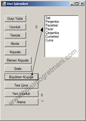 Sıralama işlemi için küçükten büyüğe doğru oluyor demiştik peki büyükten küçüğe nasıl sıralıyacağız diyorsanız hemen yardımımıza hemen Array.Reverse yetişiyor ne yapıyor peki bu reverse diziyi ters çeviriyor, küçükten büyüğe olan sıralama , büyükten küçüğe olmuş oluyor…
