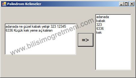 Bunun için form üzerine birer tane textbox, listbox ve buton yerleştiriyoruz butonun click olayına aşağıdaki kodları yazıyoruz. Program içerisinde ilk olarak girilen ifadeyi kelimelere ayırıp her kelimeyi ters çevirip orjinali ile karşılaştırıyoruz eğer aynı ise listboxa ekliyor