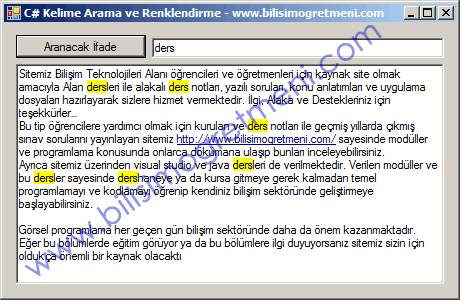 int index = 0; string metin = richTextBox1.Text; richTextBox1.Text = ""; richTextBox1.Text = metin; while (index < richTextBox1.Text.LastIndexOf(textBox1.Text)) { richTextBox1.Find(textBox1.Text, index, richTextBox1.TextLength, RichTextBoxFinds.None); richTextBox1.SelectionBackColor = Color.Yellow; index = richTextBox1.Text.IndexOf(textBox1.Text, index) + 1; }richTextBox’ta Arama Yapma ve Renklendirme Programını indir…: