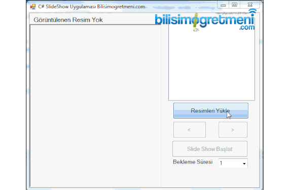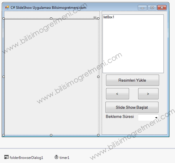 string Dirpath; int imgindex; public Form1() { InitializeComponent(); } //1 Resimlerin geçiş süresini ayarlayabilmek için timer nesnesine // 1-10 arasındaki sayılar ekleniyor.. private void Form1_Load(object sender, EventArgs e) { for (int i = 1; i < 10; i++) { comboBox1.Items.Add(i); comboBox1.SelectedIndex = 0; }//http://www.bilisimogretmeni.com/ label2.Text = "Görüntülenen Resim Yok"; } //2 folderBrowserDialog penceresi ile resimlerin olduğu klasörün seçilmesi // ve klasördeki resimlerin listesinin listbox'a alınması private void button1_Click(object sender, EventArgs e) { DialogResult dr = folderBrowserDialog1.ShowDialog(); if (dr != DialogResult.Cancel) { listBox1.Items.Clear(); Dirpath = folderBrowserDialog1.SelectedPath; string[] files = Directory.GetFiles(Dirpath, "*.Jpg"); foreach (string file in files) { int pos = file.LastIndexOf("||"); string FName = file.Substring(pos + 1); listBox1.Items.Add(FName); } listBox1.SelectedIndex = imgindex = 0; btnonceki.Enabled = true; btnsonraki.Enabled = btnshow.Enabled = true; } } //3 Slideshow başlaması için Timer nesnesi başlatılıyor // Eğer çalışıyorsada durduruluyor.. private void btnshow_Click(object sender, EventArgs e) { if (btnshow.Text == "Slide Show") { btnshow.Text = "Durdur"; timer1.Interval = int.Parse(comboBox1.Text) * 1000; timer1.Start(); //http://www.bilisimogretmeni.com/ } else { timer1.Stop(); btnshow.Text = "Slide Show"; } } //4 Listbox'dan seçilen eleman değiştiği anda picturebox'da gösterilecek olan // resmin yolu alınıp resim ve resmin ismi görüntüleniyor private void listBox1_SelectedIndexChanged(object sender, EventArgs e) { pictureBox1.ImageLocation = listBox1.SelectedItem.ToString (); string ad = listBox1.SelectedItem.ToString(); string[] parcalar = ad.Split('\\'); label2.Text = "Gösterilen Resim "+parcalar[parcalar.Count() - 1].ToString(); } //5 Önceki butonuna basılınca listbox'dan sıradaki resmin yolunun alınabilmesi için // seçili hale geliyor private void btnonceki_Click(object sender, EventArgs e) { if (imgindex > 0) { imgindex -= 1; if(imgindex ==0) {//http://www.bilisimogretmeni.com/ btnonceki .Enabled=false; } if (imgindex < listBox1.Items.Count - 1) btnsonraki.Enabled = true; listBox1.SelectedIndex = imgindex; } } //6 Sonraki butonuna basılınca listbox'dan sıradaki resmin yolunun alınabilmesi için // seçili hale geliyor private void btnsonraki_Click(object sender, EventArgs e) { if (imgindex < listBox1.Items.Count - 1) { imgindex += 1; if (imgindex == listBox1.Items.Count - 1) btnsonraki.Enabled = false; if (imgindex > 0)//http://www.bilisimogretmeni.com/ btnonceki.Enabled = true; listBox1.SelectedIndex = imgindex; } } //7 Seçilen zaman diliminde sonraki resme geçilmesi için sonraki butonu tetikleniyor private void timer1_Tick(object sender, EventArgs e) { btnsonraki.PerformClick(); }Download “C# PictureBox SlideShow” SlideShowApp.zip – Downloaded 3948 times – 59,58 KB