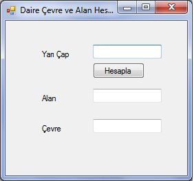 Bu Dersimizde Visual Studio C# ile Dairenin Alan ve Çevre hesaplaması nasıl yapılır onu inceleyeceğiz öncelikle aşağıdaki form görüntüsünü oluşturuyoruz. Form üzerinde 3 adet textbox, 3 adet label ve bir tanede Button yerleştiriyoruz.