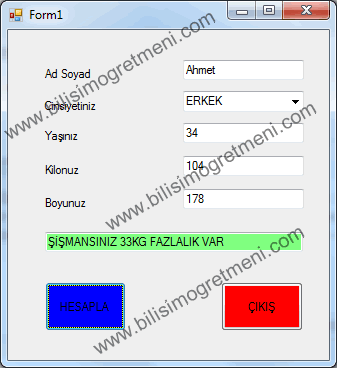 Visual Basic .Net ile kullanıcının girmiş olduğu bilgilere göre ideal kilosunu hesaplayan ve sonuç bölümünde kaç kilo fazlası olduğunu yazan programı yapabilmek için ilk olarak aşağıdaki form tasarımını yapıyoruz. ideal kilo hesaplamasında kullanılacak olan formül bayanlar için BOY – ((BOY – 140) / 4 + 100), erkekler için BOY- ((BOY – 150) / 4 + 100) olacak..