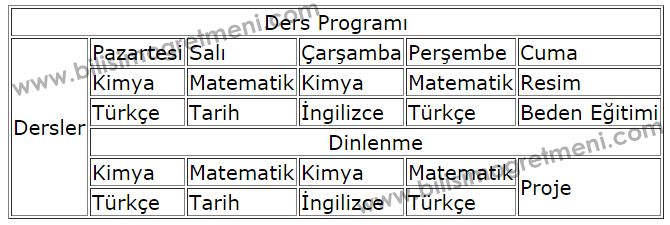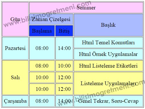 <html> <head> <title>Bilisimogretmeni.com Tablo Uygulamarı</title> </head> <body> <table border="1" width="400" height="300"> <tr align="center" BGCOLOR="#FFCCFF"> <td rowspan="3" >Gün</td> <td colspan="3">Seminer</td> </tr> <tr align="center" BGCOLOR="#AABBFF"> <td colspan="2">Zaman Çizelgesi</td> <td rowspan="2">Başlık</td> </tr><!-- www.bilisimogretmeni.com --> <tr align="center" BGCOLOR="#1133FF"> <td>Başlama</td> <td>Bitiş</td> </tr> <tr align="center" BGCOLOR="#CCFFFF"> <td rowspan="2">Pazartesi</td> <td rowspan="2">08:00</td> <td rowspan="2">14:00</td> <td>Html Temel Komutları</td> </tr> <tr align="center"BGCOLOR="#CCFFFF"> <td> Html Örnek Uygulamalar </td> </tr> <tr align="center" BGCOLOR="#FFFF99"> <td rowspan="3"> Salı </td><!-- www.bilisimogretmeni.com --> <td>08:00</td> <td>10:00</td> <td>Html Listeleme Etiketleri</td> </tr> <tr align="center" BGCOLOR="#FFFF99"> <td>10:00</td> <td>12:00</td> <td rowspan="2">Listeleme Uygulamaları</td> </tr> <tr align="center" BGCOLOR="#FFFF99"> <td>10:00</td> <td>12:00</td> </tr> <tr align="center" BGCOLOR="#CCFFFF"> <td >Çarşamba</td> <td >08:00</td> <td >14:00</td> <td>Genel Tekrar, Soru-Cevap</td> </tr> </table><!-- www.bilisimogretmeni.com --> </body> </html>