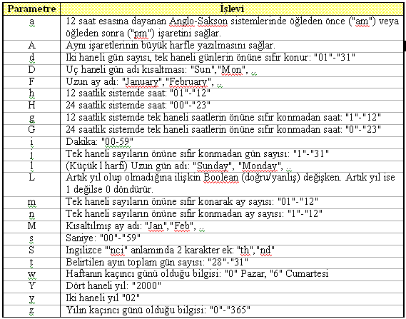 Normalde date() fonksiyonunun içine “-” işaretinde olduğu gibi yazılması üzere başka metinler de girebilirsiniz. Ama pek çok harfe özel bir anlam yüklendiği için bu tür girişimler başarılı bir çıktı vermeyecektir. Örneğin yukarıdaki örnekteki “Tarih” ifadesini date()’in içine ekleyemedik. Çünkü T, a, r, i ve h harflerinin hepsinin fonksiyon için ayrı bir anlamı var.