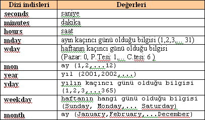 getdate() fonksiyonun döndürdüğü dizinin indisleri ve değerleri aşağıdaki tablodaki gibidir: