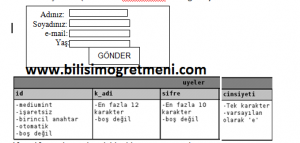 k_adi varchar(12) not null, sifre varchar(10) not null, cinsiyeti char(1) default ‘e’ )