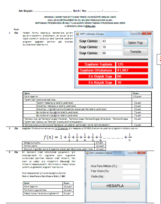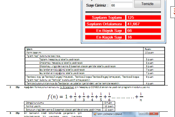 SORU-1) Aşağıdaki formu tasarlayıp, textbox’lara girilen sayıların toplamını, ortalamasını, en büyük ve en küçük olanlarını buldurup label içerisine yazdıran programı aşağıdaki adımları göz önünde bulundurarak tasarlayınız.
