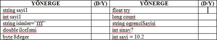 Soru 2: Aşağıdaki değişken tanımlamalarının karşılarına doğru (D) ya da yanlış (Y) olduğunu gösteren ifadeler koyunuz.