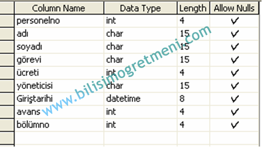 2.Personel1 adında aşağıdaki niteliklere sahip bir tablo yaratın